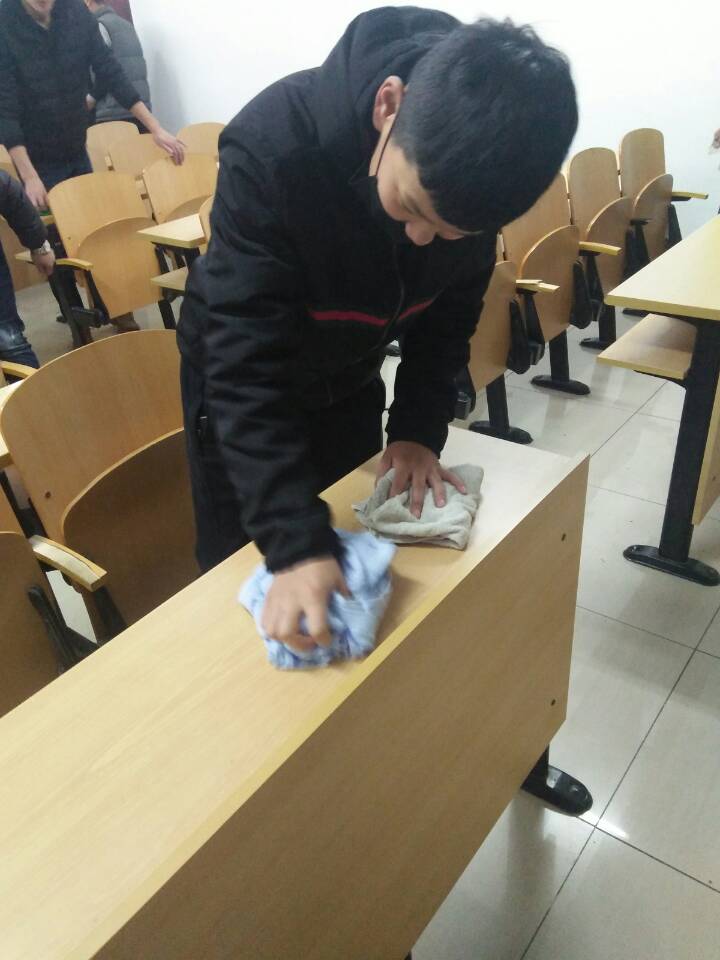 活动首先由徐延丽老师为同学们讲解相关的环境卫生知识,她提醒学生们一定要文明上课,保护好学习生活环境,做一名合格、文明、爱校的燕大学生。随后带领同学们对体育馆109和110的教室进行了彻底的清扫,包括课桌、黑板、玻璃、地面等死角。同学们各司其职,在各自卫生分工区进行认真地清扫,并且在互相帮助中体现集体的力量,没过多久,被打扫后的教室焕然一新。