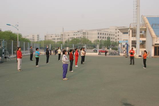 每天早晨6点钟实习生赵文楠准时到操场带领学校职工锻炼一小时。图为实习生带领我校职工进行太极拳、八段锦锻炼。太极拳动作舒缓、柔和具有良好的健身、调心锻炼价值,在其乐融融的氛围中大家进行晨间锻炼,既锻炼身体,又愉悦身心。每天,赵文楠同学精心安排授课内容,细心指导技术动作。所授的八段锦、太极拳深受学校老师们的喜爱。