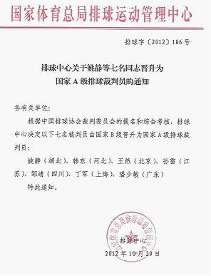此次全国共晋升A级裁判7人,通过近5年的国内、国际赛事的考核,参加了全国361排球联赛、全国361排球大奖赛、全国排球锦标赛、 广州亚运会、深圳世界大运会、包括教育举办的全国大学生运动会排球赛、全国中学生运动会排球赛 ,而且执裁了在天津刚刚结束的大运会男排决赛的工作。 最后9月26日在北京的2012—2013年全国排球联赛裁判工作会议上,确定17人考核名单,进行了谈话和理论考核,最后晋升7人为A级裁判。晋升A级裁判后将有资格担任全国联赛和2013年全运会主裁判的资格。
