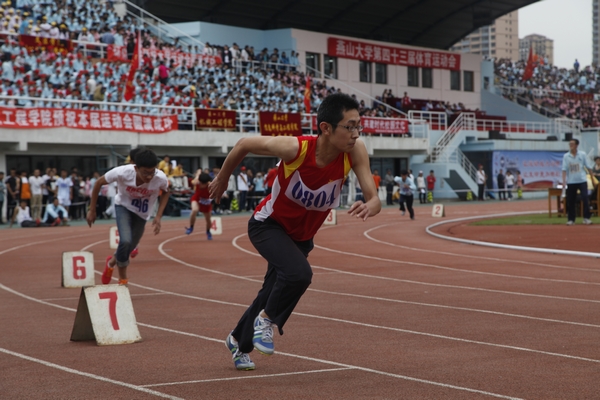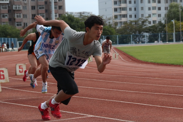 文法学院刘建在200米比赛中起跑的瞬间(付心怡/摄)