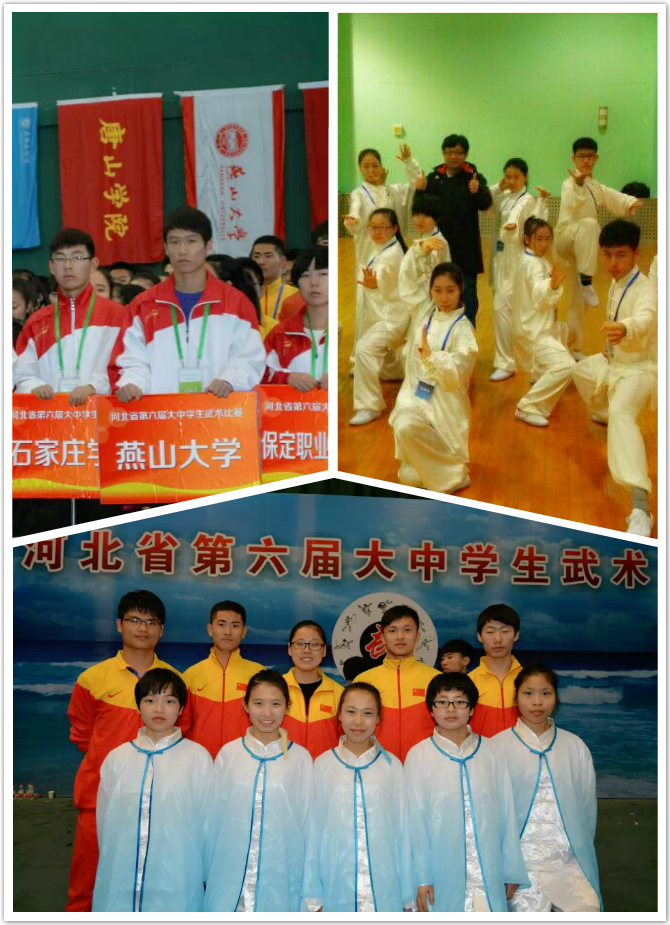 2015年1月4日—7日,由河北省教育厅主办的河北省第六届大中学生武术比赛在秦皇岛奥体中心隆重举行。本次比赛由来自全省41支代表队498名运动员参加比赛。我校派出乌鸦传媒代表队和里仁学院代表队两支队伍参赛,体育学院党委书记许国喜老师任乌鸦传媒代表队领队,体育学院赵文楠老师、张晓东老师任教练员;里仁学院崔学臣老师为里仁代表队领队,里仁学院姜雨峰老师为教练员;体育学院董玉强老师为随队裁判。我校武术健儿在比赛中发扬敢打敢拼的精神,不畏强手,最终取得乙组项目2金2银3铜的好成绩。