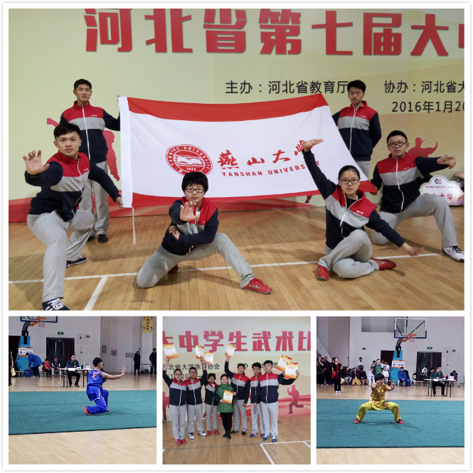 2016年1月20日至23日,由河北省教育厅主办、河北省大学体育协会协办、河北师范大学承办的河北省第七届大中学生武术比赛在河北师范大学隆重举行。由体育学院院长王大鹏带队,体育学院董玉强、张晓东担任教练员,赵文楠老师担任随队裁判,共派出7名武术队运动员参赛,我校武术健儿取得乙组比赛项目一金一银一铜好成绩。赵文楠老师被大会评为体育道德风尚裁判员,董玉强老师获得体育道德风尚奖教练员荣誉,来自经济管理学院13级的苑聪聪同学被大会评选为体育道德风尚运动员。