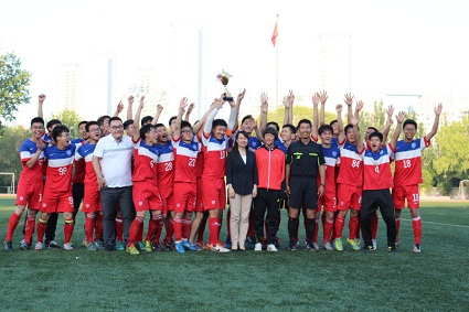 冠亚军决赛中,学校多个部门的领导和各学院学生一起到第一体育场为运动员加油助威。校团委书记李曦达老师为获得冠军的电气工程学院颁发了冠军奖杯。