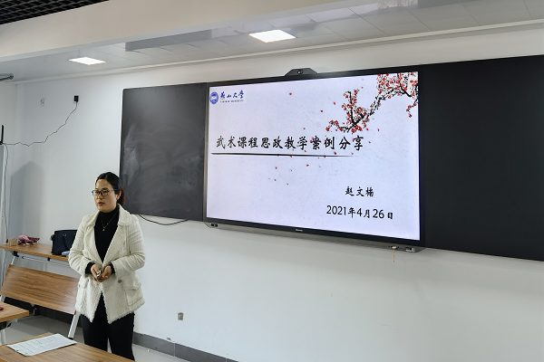 赵文楠老师以武术运动课程为例做课程思政案例分享,她分别从课程思政的内涵与要求、体育教学特点、武术课程思政如何实现立德树人三个方面进行讲解,提出武术课程要注重武德教育,以礼始以礼终,在武术课第一次课向学生教授武术抱拳礼的动作和涵义,在课堂常规师生问好中行武术抱拳礼仪,涵养尊师重道、谦虚礼让、文武兼备的思想理念。在教学目标设计上要体现出价值观引导,在教学方式方法上要以教学目标为导向,合理运用教学方法和手段,以达成课程思政教育目标。在教学内容方面要从武术理论知识、武术技术动作、武术谚语、动作攻防含义、学武、练武、用武过程充分挖掘武术运动蕴含的思政元素,巧妙的融入到武术课堂教学中。在课程考核评价方面要增加武德考核,制定体现价值观引导的课程考核评价方式,建立过程性评价与总结性评价相结合的评价方式,将个人考核和小组考核有机结合起来,记录平时考核成绩,评价的焦点转向学生在课堂上的行为表现、情绪体验、过程参与、知识技能获得。随后教师们就各自教学实践分享交流经验和做法,提出体育课应有一定强度刺激来达到强身健体、锤炼意志品质的目的;教师应具备相应的健康教育知识、急救知识和应变课堂突发事件的能力,加大体育教师职业能力的培养,以提升体育课程教育教学质量,提升教师教书育人能力。