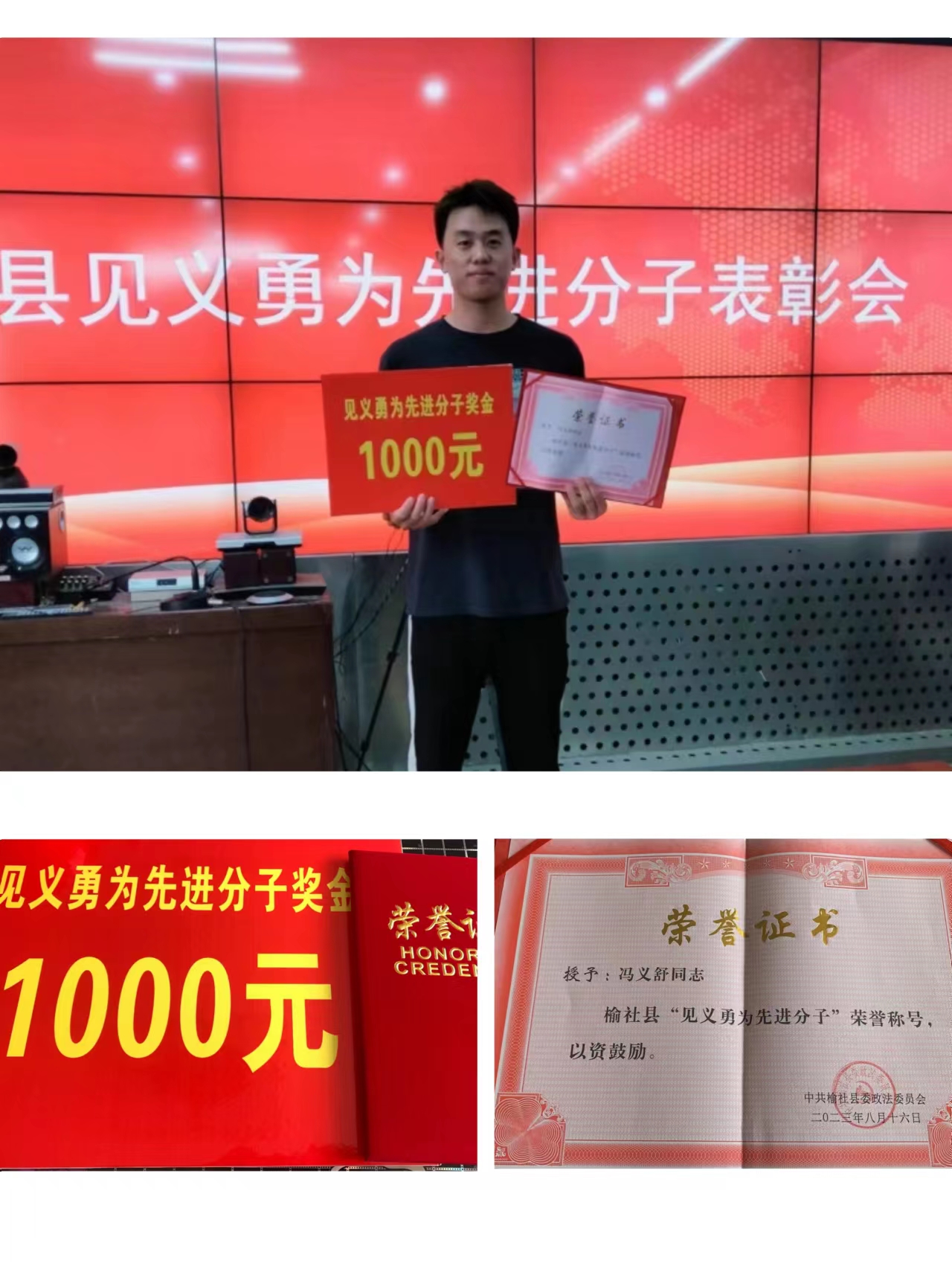 近日,冯义舒被中共榆社县委授予榆社县“见义勇为先进分子”荣誉称号。他表示,见义勇为是中华民族的优良传统,更是当代大学生应该传承发扬的美德,能够把在学校中掌握的专业技能和抢救理论知识运用到实践中,挽救两条鲜活的生命,他感到无比的光荣和自豪!