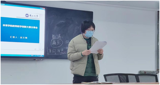 为强化我院师资队伍建设,提高教师教育教学水平,鼓励教师创新体育教学,体育学院于11月30日晚上七点在109会议室举办了教师教学创新大赛分享会。会议由学院副院长林琴琴主持。