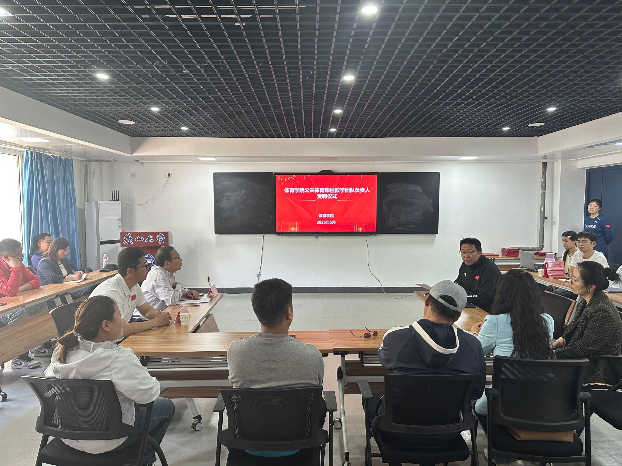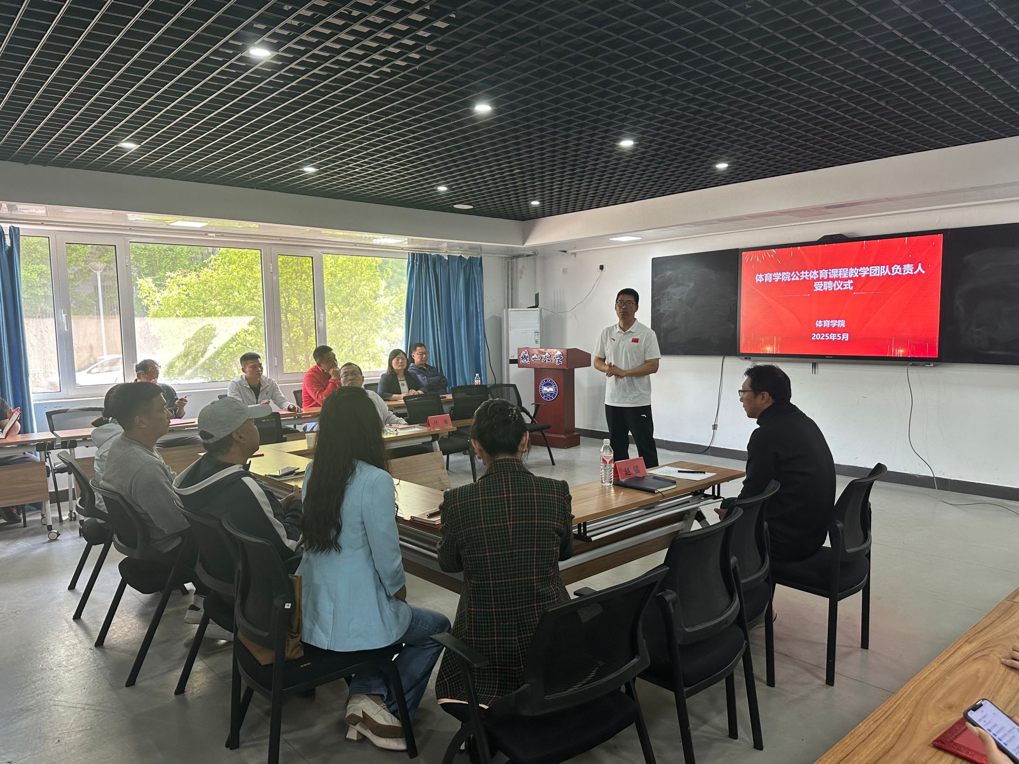 为进一步加强公共体育课程建设,提升教学质量,5月14日下午16:00,体育学院公共体育教研室在体育学院109B会议室隆重举行教学团队负责人聘书颁发仪式。学院党委书记任海、院长杨广辉出席仪式并为足球、篮球、排球等15个体育项目教学团队负责人颁发聘书,副院长赵猛主持活动,公共体育教研室全体教师共同见证这一重要时刻。